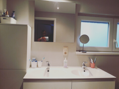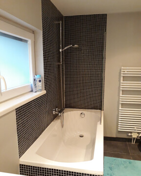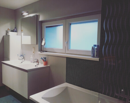 Een stijlvolle badkamer met ligbad+douchewand, dubbele wastafel met inbouwkast, aansluiting voor wasmachine & droogkast.