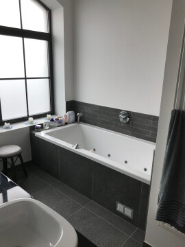 - Badkamer met een inloopdouche met regendouche, bubbelbad, twee waskommen, en toilet